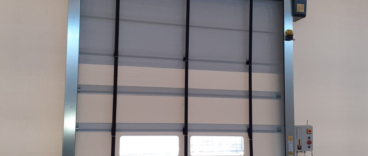 Capannone retrattile indipendente mod. KT Frontale dim.mm.largh16000xlungh8000xHu4000. Per la chiusura della testata anteriore è stata scelta una porta ad impacchettamento rapido mod. Fast Pack Smart dim.mm.largh3000xH3000 di colore grigi chiaro
